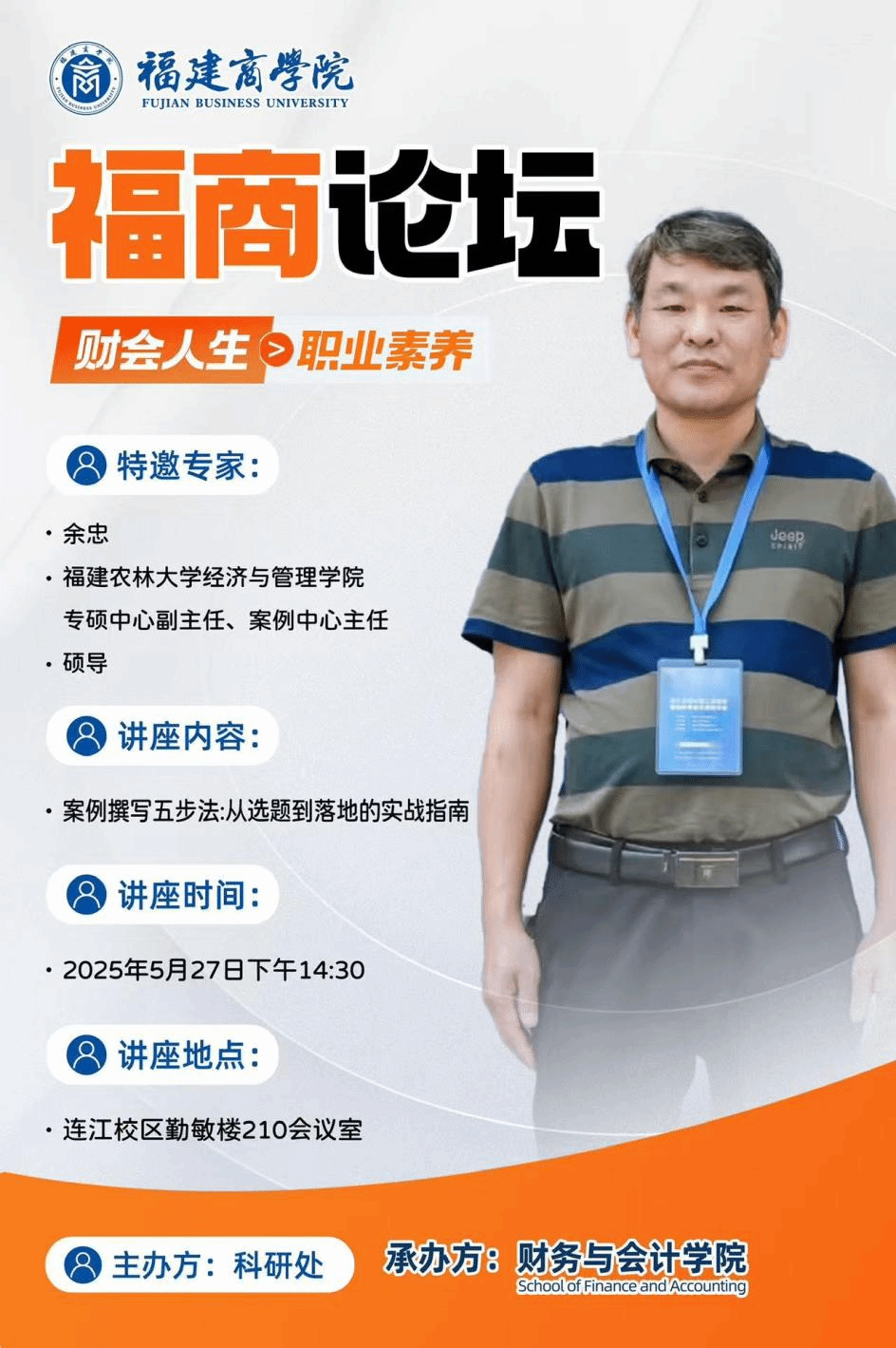 为进一步提升教师管理教学案例的开发水平,助力教学质量和科研能力的双向突破,5月27日下午,我们再次邀请福建农林大学经济与管理学院案例中心余忠主任莅临福商论坛主讲《案例撰写五步法:从选题到落地的实战指南》专题讲座,学院全体专任教师参会。