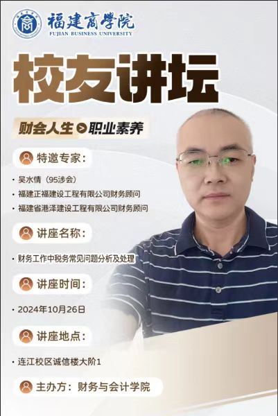 2024年10月26日,95涉外会计的吴水情校友为我们学生开设了题为《财务工作中税务常见问题分析及处理》的讲座。