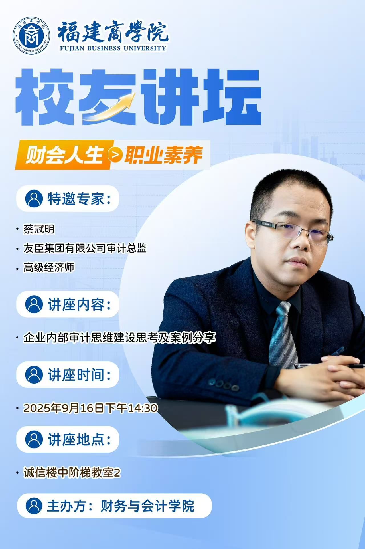2025年9月16日,02会计与审计专业的蔡冠明校友为我们学生开设了题为《企业内部审计思维建设思考及案例分享》的讲座。