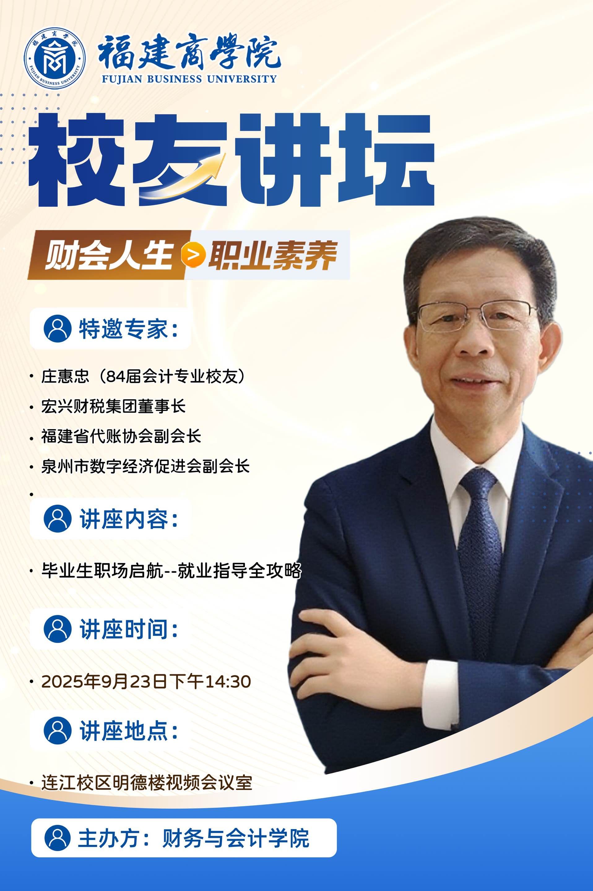 2025年9月23日,84届会计专业的庄惠忠校友为我们学生开设了题为《毕业生职场启航--就业指导全攻略》的讲座。