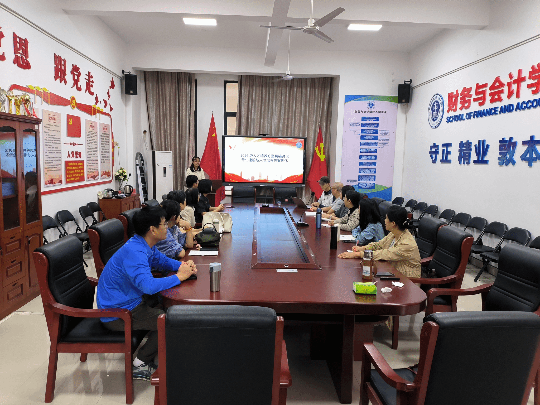 活动开始,刘希婧老师依据青教赛标准,进行《会计学》“权责发生制与收付实现制”章节说课展示,融入AI分析学情,用例题、动图、讨论等帮助学生理解知识,通过案例引导学生理解权责发生制,教学设计体现“以学生为中心”。刘林老师以“工业企业业务流程”为主线进行《会计学》说课分享,拆解流程构建闭环教学模型,破解“会计孤岛”难题。展示结束后,与会老师就教学内容、AI设计等展开讨论,陈珠芳老师肯定了两位老师的说课表现,并期望在内容上加强课程思政融入和提升高阶性。随后,与会老师围绕“对接国家战略、服务区域经济、打造数智会计特色”研讨2026版人才培养方案修订,明确“厚基础、强交叉、重实践、能创新”思路,为修订注入动力。